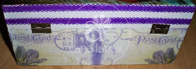 La verdad es que esta caja me encanta. Está decorada con la técnica de decoupage usando servilletas (para la caja) y papel de seda (para la imagen de la tapadera). Para completar la decoración de la tapadera cinta morada.
