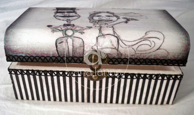 Para que la caja fuera personalizada 100% prepararon una caricatura de los novios que yo imprimir en papel de seda para poder aplicarla sobre la tapadera de la caja con la técnica de decoupage.